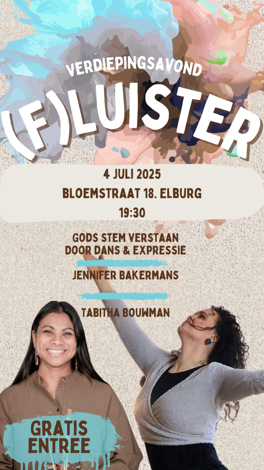 Begin juli is het zover. Dan komt Jennifer Bakersmans weer helemaal uit Brabant, naar Elburg toe, voor een verdiepingsavond over het verstaan van Gods stem. Deze keer neemt ze Tabitha Bouwman en Esther Schreurs mee. Samen zullen ze delen vanuit hun passie over dans & expressie. Want ook daardoorheen wil God spreken!